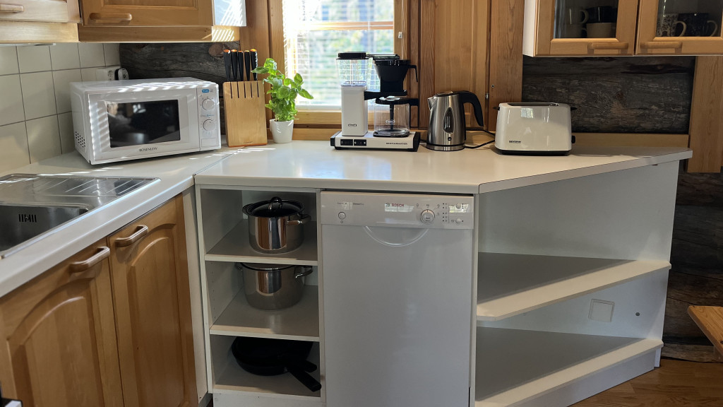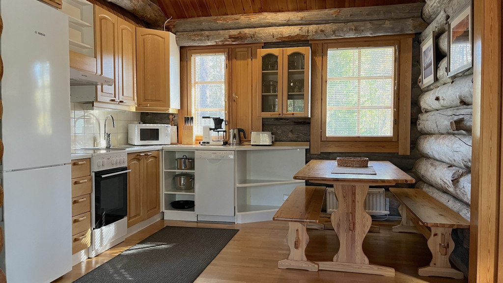 Astianpesukone, Astiasto, CD-soitin, Grilli (Grillikatos), Imuri, Jääkaappi + pakastin, Lasten syöttötuoli, Leivänpaahdin, Liesi + uuni, Liesituuletin, Mikroaaltouuni, Parisängyt (1 x 140 cm, 1x 160 cm), Radio, Sängyt (3 runkopatjaa), Takka ja takkapuut, Vedenkeitin, Kuivauskaappi, Pesukone