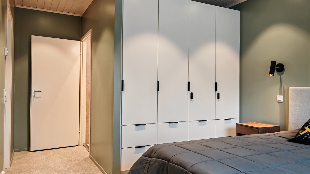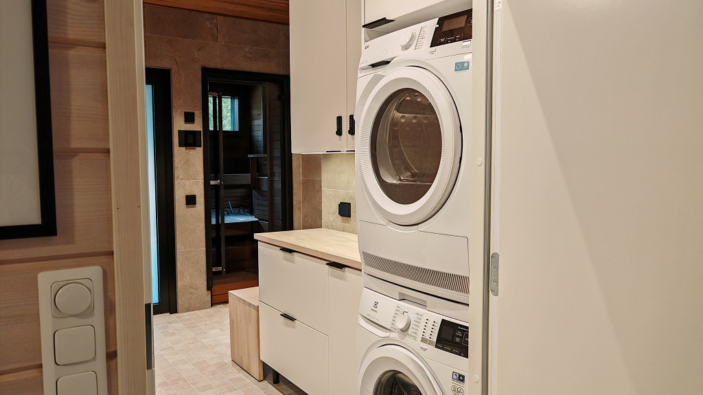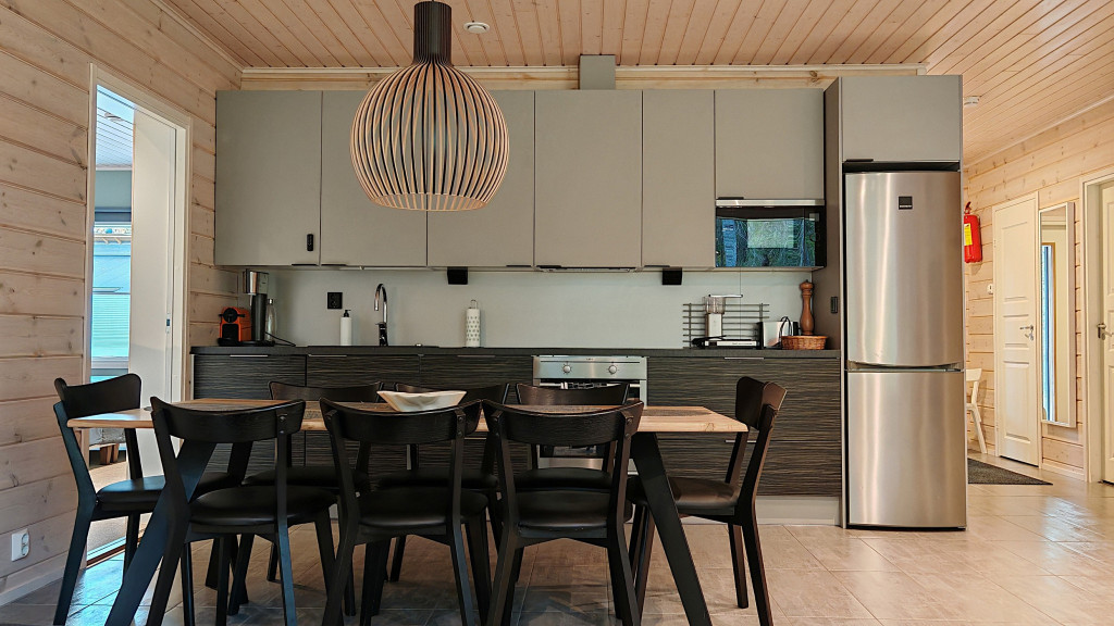 Astianpesukone, Astiasto, Hiustenkuivain, Imuri, Jääkaappi + pakastin, Kahvinkeitin, Koneellinen ilmanvaihto, Kuivausrumpu, Lasten syöttötuoli, Leivänpaahdin, Liesi + uuni, Liesituuletin, Mikroaaltouuni, Parisängyt (1), Radio, Sohva, Sängyt (6), Takka ja takkapuut, Taulu-TV / digisovitin, Vedenkeitin, Vuodesohva, Kuivauskaappi, Pesukone